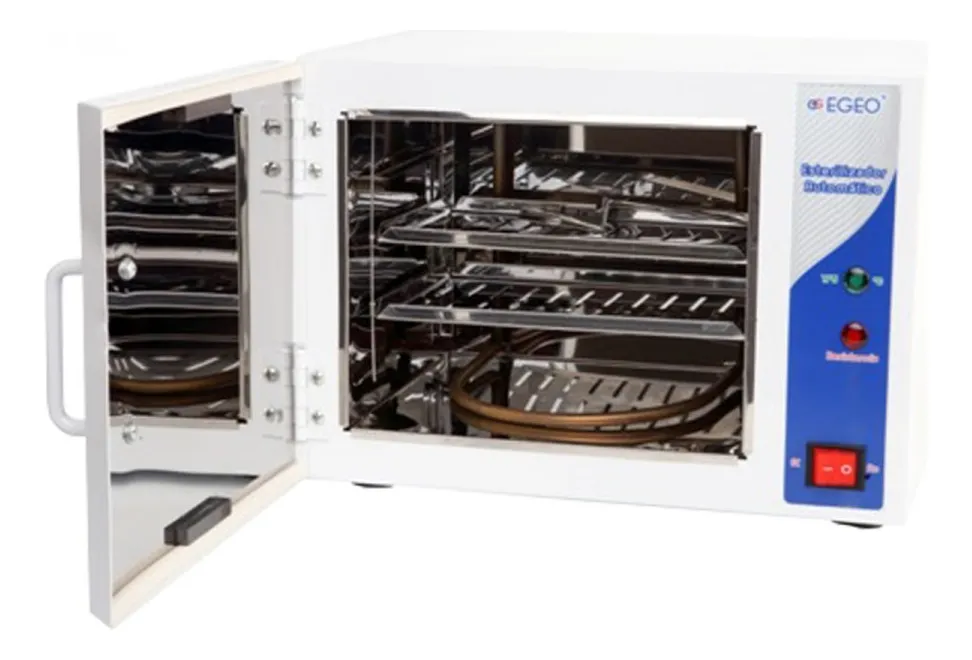Sus dos amplias bandejas perforadas de acero inoxidable permiten acomodar gran cantidad de instrumental, no oxida a los mismos ni afecta puntas ni filos.