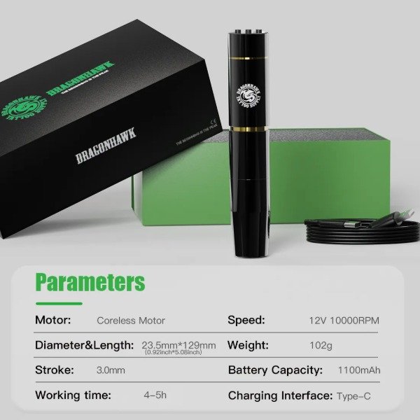 - Invierta en un sistema de tatuaje completo. La Dragonhawk WQP-208 garantiza seguridad e higiene con su diseño fácil de limpiar y compatibilidad con cartuchos estándar.